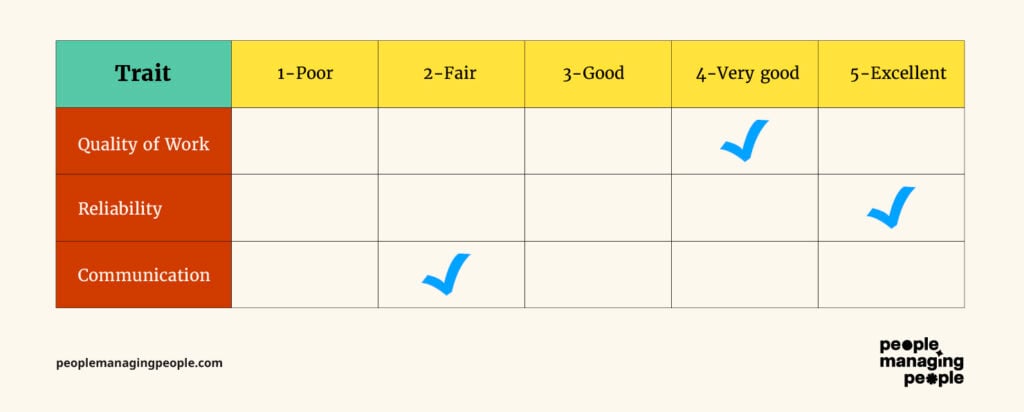 Each row is a trait (like quality, reliability, communication), and each column is a score (such as 1–5). It looks a lot like a spreadsheet, and managers can fill it out in one view.
