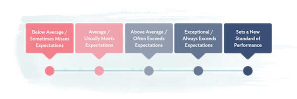 5 | Moved the company forward with performance in role (and beyond) | Fully competent in role and contributed beyond role during performance period. Performance is easily recognizable as changing the organization for the better (can be measured in increased revenue, increased employee/customer satisfaction or decreased costs) | Highly competent in the role and driving constant improvements in all areas. High potential for next level work and/or led company changing initiative. |
