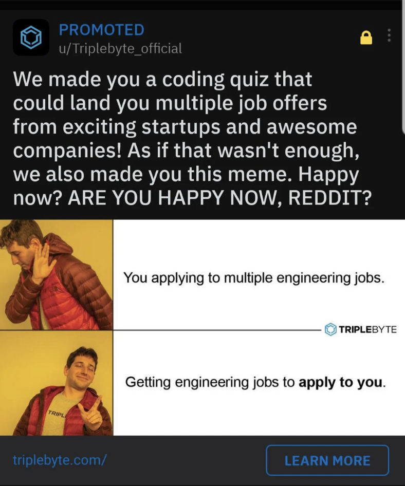 Tech recruitment agency Triplebyte showing us how it’s down by jumping on the popular Drake meme.