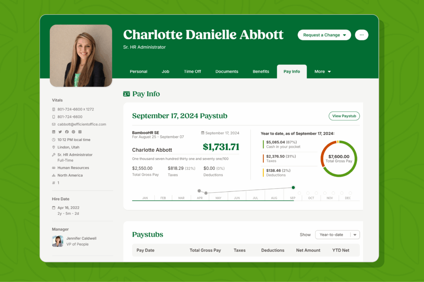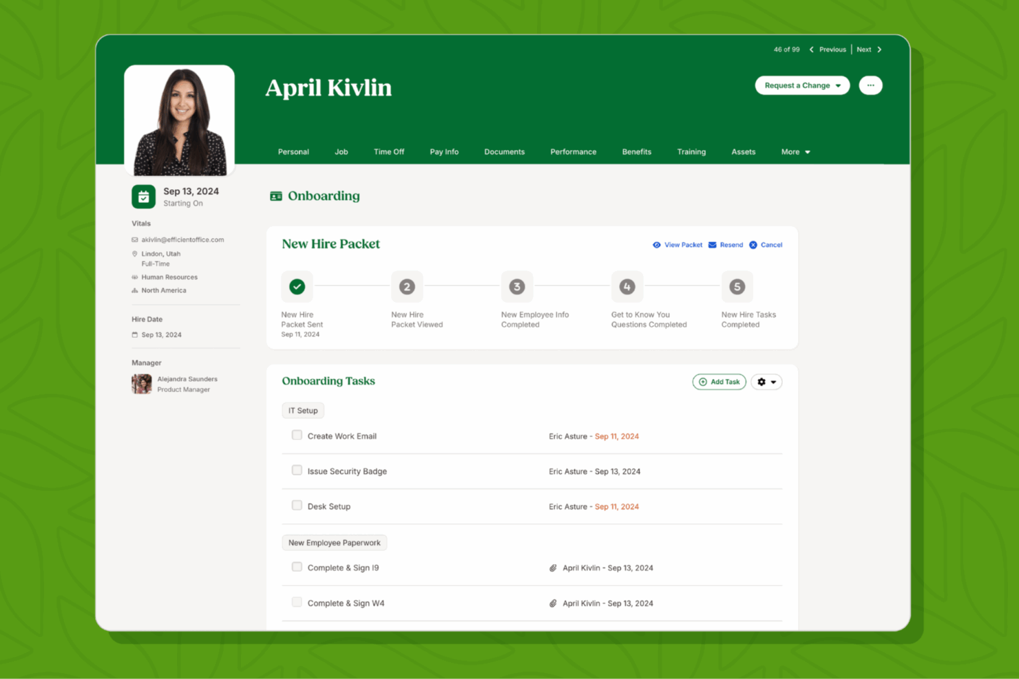 - Employee self-service features help staff access their data, request time off, sign documents, and more.