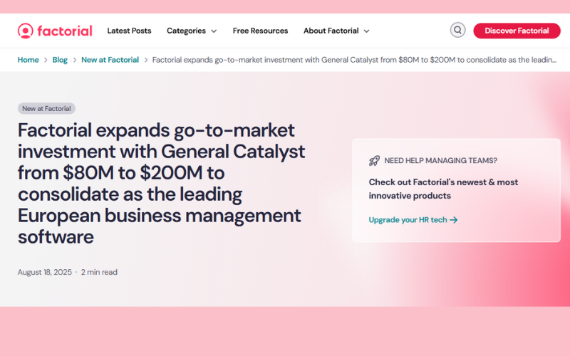 Factorial has secured a major boost in backing from General Catalyst. The firm increased its go-to-market investment from $80 million to $200 million, showing strong confidence in Factorial’s growth plans.