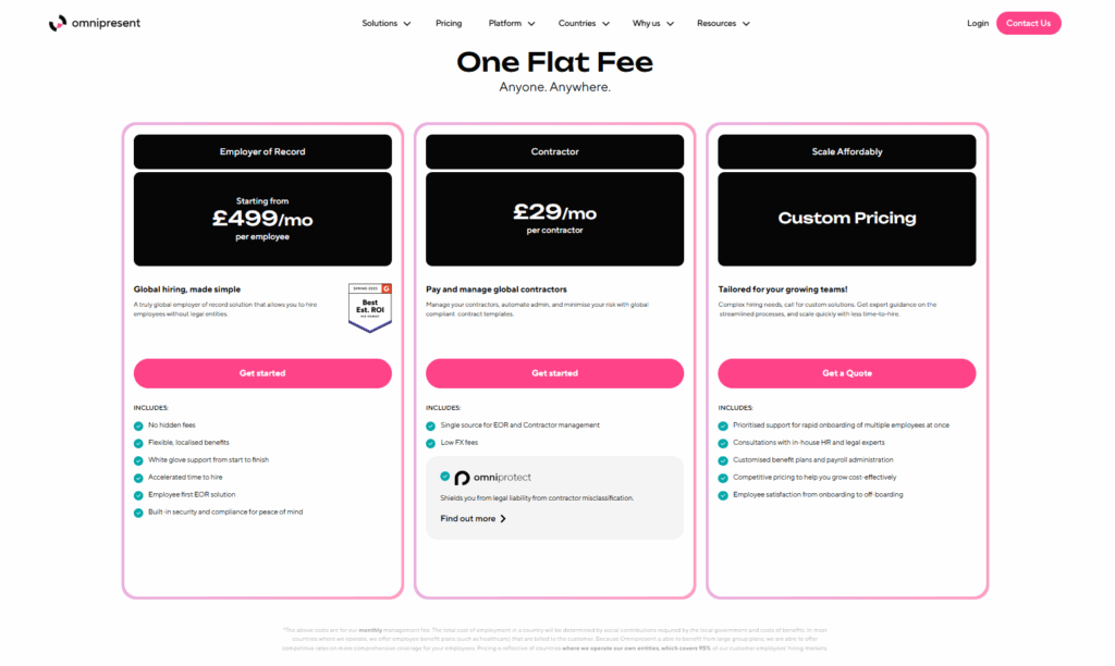 Omnipresent's pricing starts at £29/person/month (approx. $39 USD/person/month) for their lowest-cost contractor management plan, or £499/person/month (approx. $669 USD/person/month) for their employer of record plan.