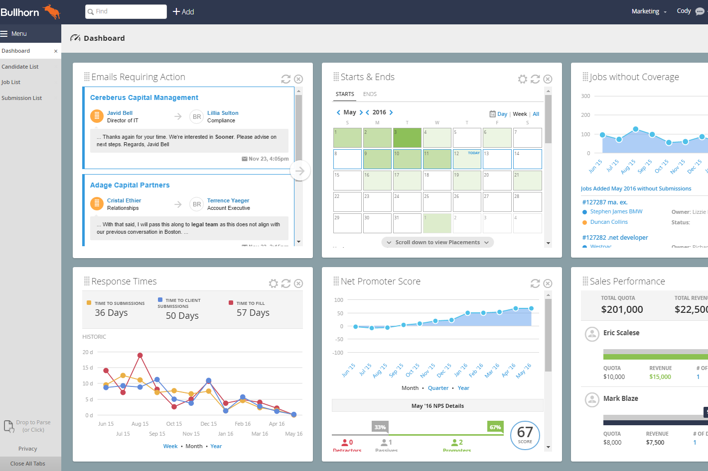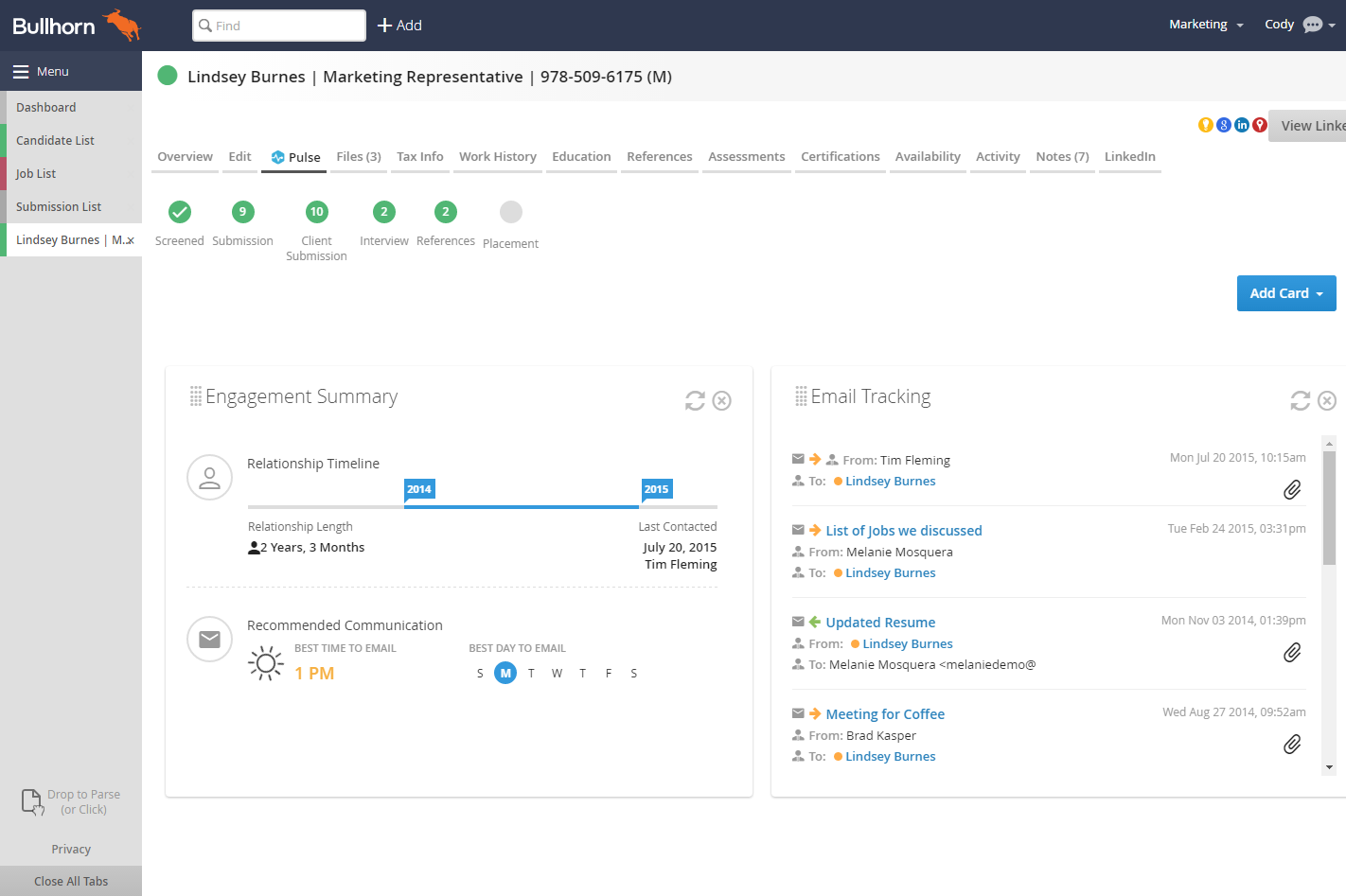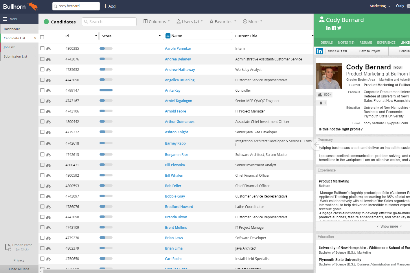 Tracker’s customizable workflow automation and integrated AI tools help you manage candidate pipelines and client relationships without constant manual updates. Bullhorn’s fast resume parsing and robust reporting features let you quickly process applicants, making it easier to stay organized and responsive throughout your day.